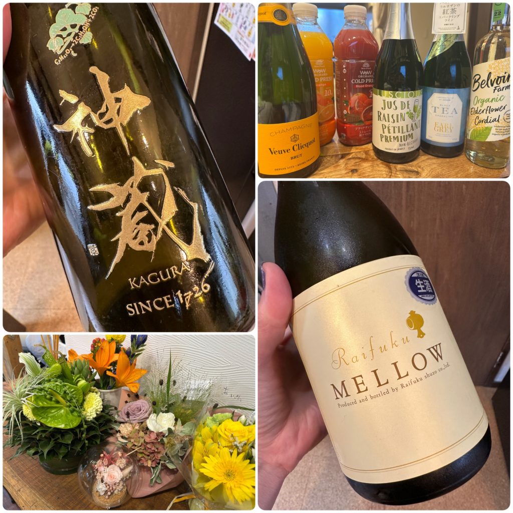 普段は上がれないお店の2階を開放してのお食事に、日本酒のペアリングをしているお客様が縁のために日本酒を2種類セレクトしてくれての日本酒カウンターがOPEN!